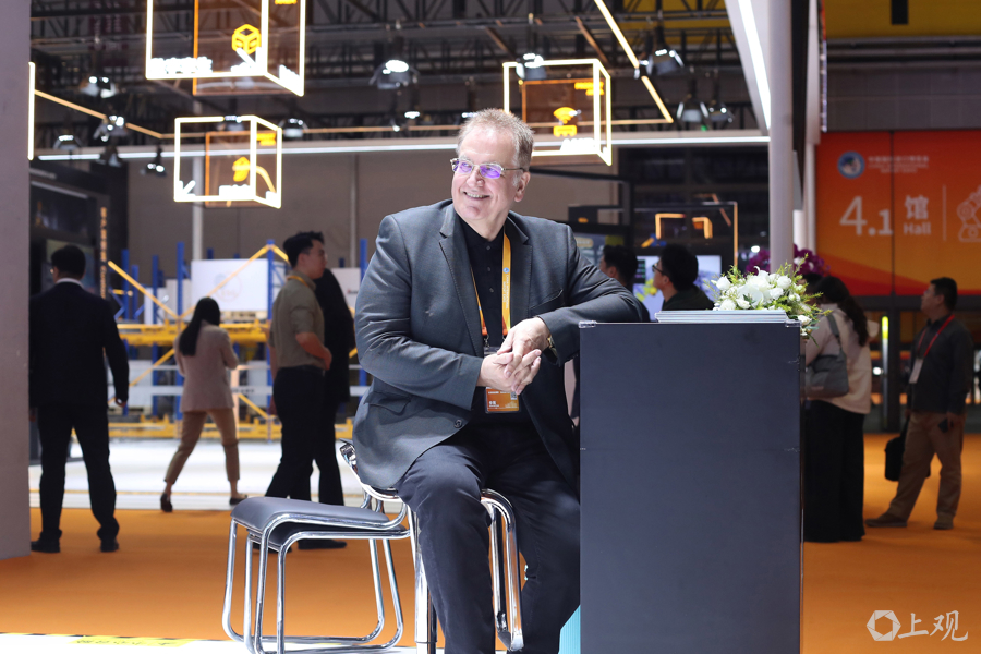 2025年11月5日,德国人Hans Kobschaetzky坐在4.1馆诺亚机器人展台的前台,热情与每一位对其企业机械臂产品感兴趣的客商接洽。这是他的第一届进博会。
