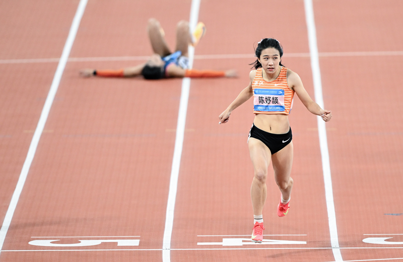 新华社照片,广州,2025年11月19日\n 11月19日,浙江队选手陈妤颉(右)在比赛中冲线。她获得冠军。\n 当日,第十五届全国运动会田径项目女子200米决赛在广州举行。\n 新华社记者 邓华 摄