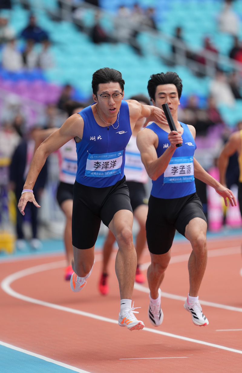 11月20日,湖北队第二棒选手李泽洋(左)与第一棒选手李孟源在比赛中交接棒。湖北队晋级决赛。\n 当日,第十五届全国运动会田径男子4x100米接力预赛在广州举行。\n 新华社记者 李一博 摄