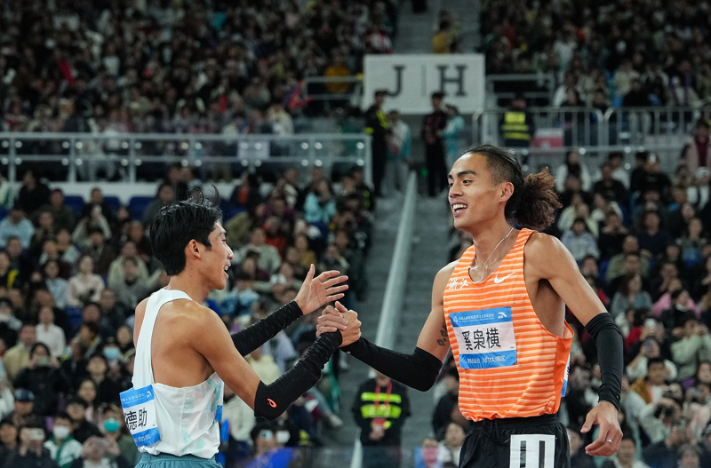 新华社照片,广州,2025年11月20日\n 11月20日,广西队选手刘德助(左)和浙江队选手奚枭横在比赛后相互致意。他们分别获得冠军和季军。\n 当日,第十五届全国运动会田径男子1500米决赛在广州举行。\n 新华社记者 江汉 摄