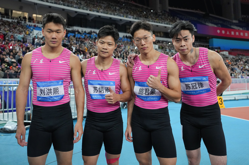 11月20日,广东队选手刘洪熙、苏炳添、施君豪、陈冠锋(从左至右)在比赛后。\n 当日,第十五届全国运动会田径项目男子4X100米接力决赛在广州举行。\n 新华社记者 江汉 摄