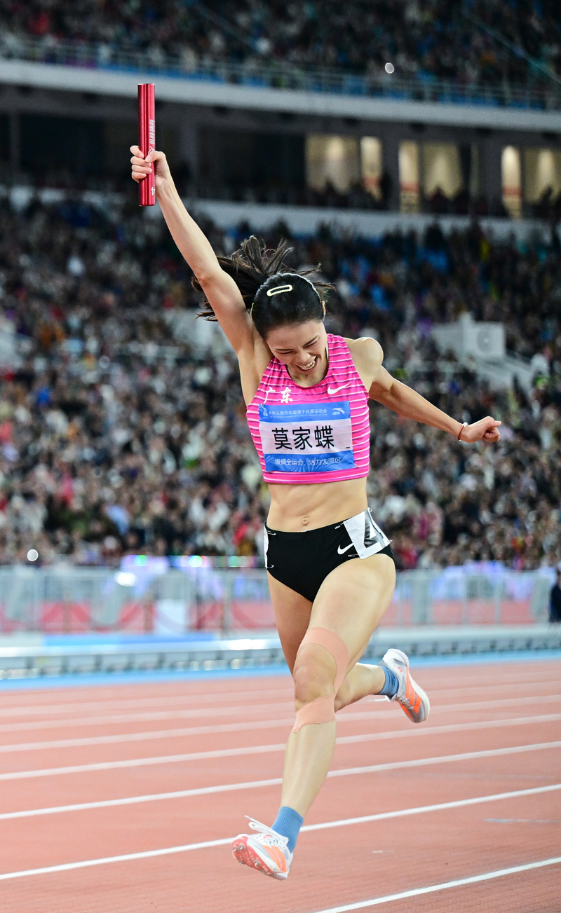 新华社照片,广州,2025年11月20日\n 11月20日,广东队选手莫家蝶在比赛中冲线。广东队获得冠军。\n 当日,第十五届全国运动会田径项目女子4X400米接力决赛在广州举行。\n 新华社记者 江汉 摄