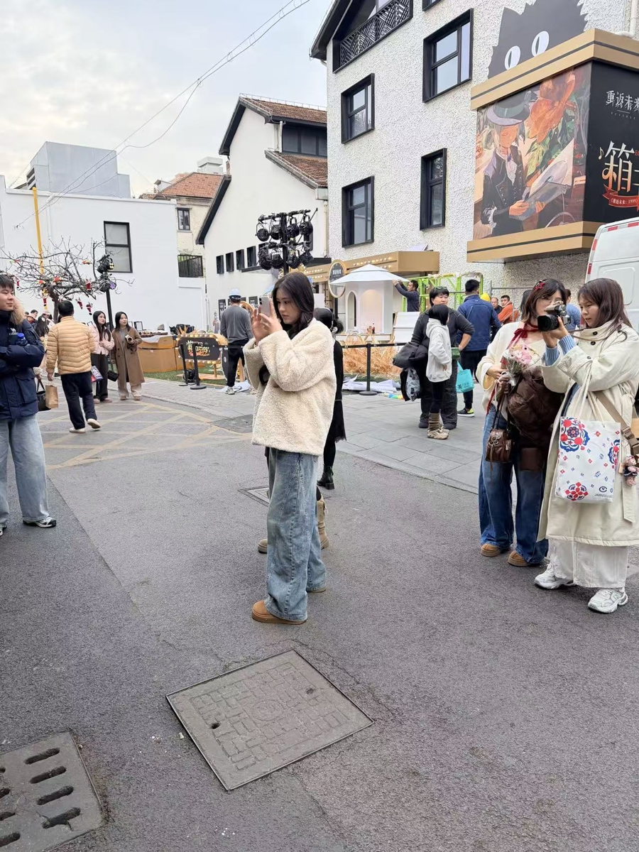 记者到达现场时,临近傍晚时分,街区内的灯光尚未完全点亮,愚园路就已人流如织。记者从江苏路一路行进至愚园路,同行的路人基本都朝着愚园路1088弄的大门内鱼贯而入。挤进大门,记者的面前是一条宽度不足三米的小巷,巷子两侧沿街开设店铺,以咖啡、甜品等轻餐饮店为主,另有几家潮玩及服饰店,颇具时尚气息。临近年关,店铺外都放置了丰富的布景,营造出浓厚的节日氛围。小巷内,随处可见打扮精致的游客互相拍摄,不少热门的“出片点位”旁,甚至排起了长队。一时间,这条巷子俨然成为了“步行街”,游客们随性地走走停停,行进速度极为缓慢。