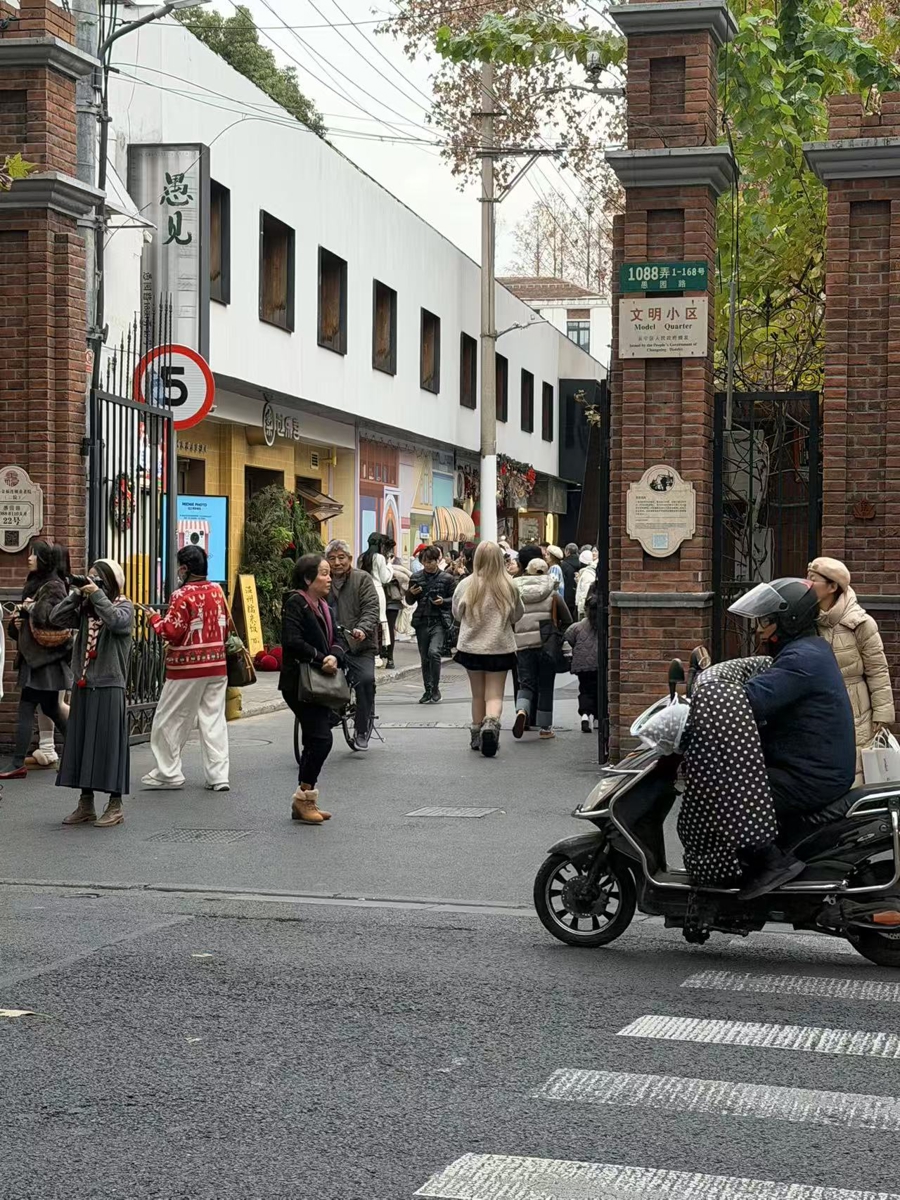 由江苏路转进愚园路,密密麻麻的人流一直延伸至愚园路1088弄的一条小弄堂内,一台台举起的相机提醒着,眼前的是一个不折不扣的网红街区。然而,就在门牌的另一侧,一块“文明小区”的牌子赫然映入眼帘:从弄堂口往里走,这里也是宏业花园100多户居民的家。