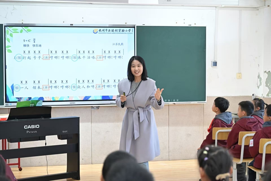 浙江省萧山区亚运村实验小学的翁迦密老师上的《打麦号子》课,以“劳动”为主线,通过声势律动、情境表演等方式,引导学生感受劳动号子的独特魅力。最精彩的是“创号子”环节,同学们分组选择生活中的劳动场景,创编专属劳动号子并进行创意秀。翁老师以美育人的教学理念,让学生在音乐实践中体悟劳动的快乐,深化对传统民间文化的认同,感受艺术与生活融合的幸福。