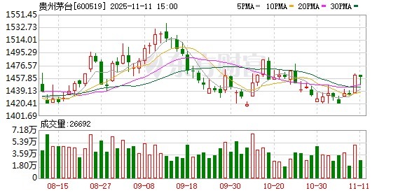 截至11月11日收盘,贵州茅台报1458.99元/股,跌0.23%。