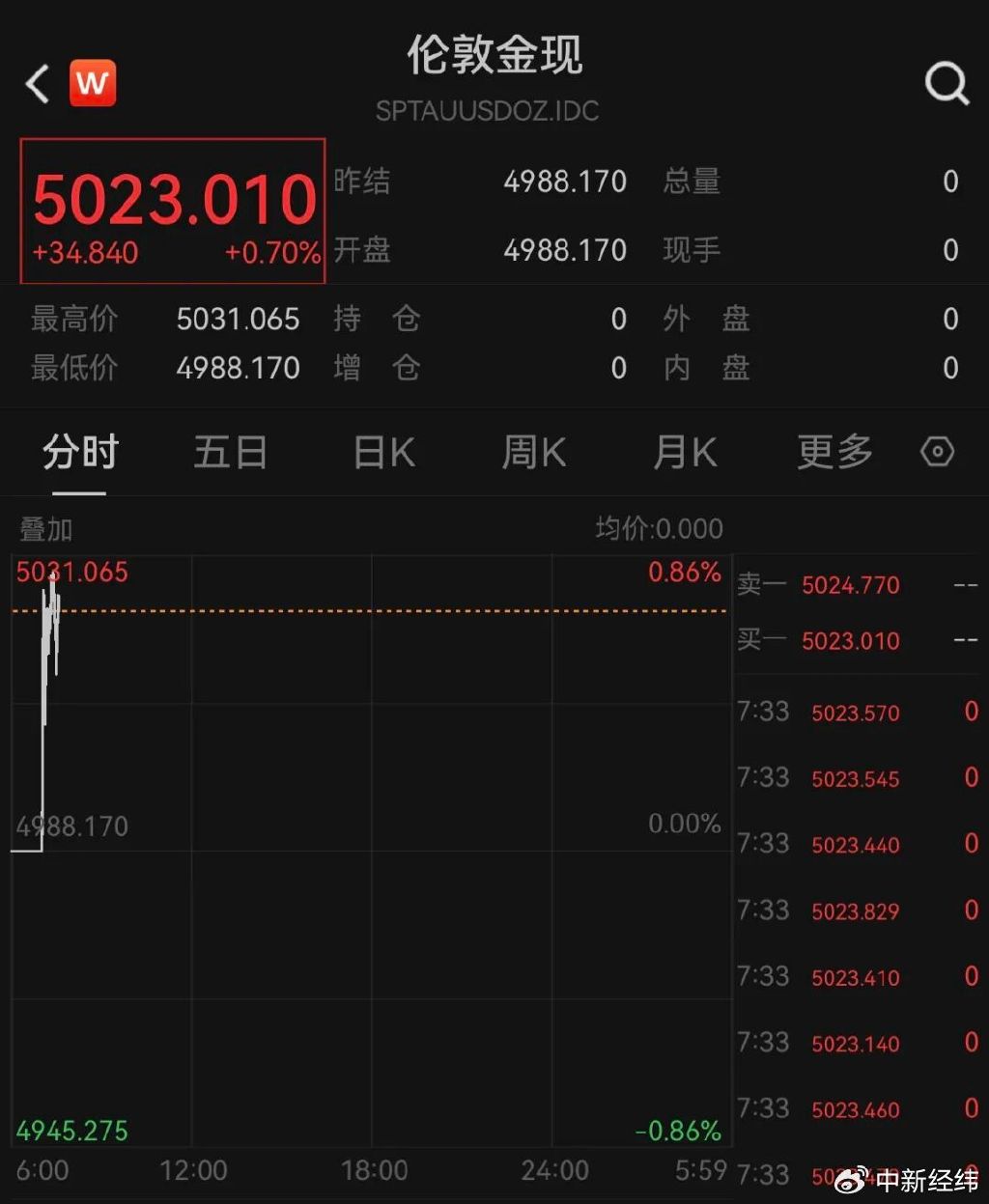 26日早间,现货黄金直线拉涨,盘中首次突破5000美元/盎司,再创历史新高。截至发稿,报5023.010美元/盎司,涨0.70%。