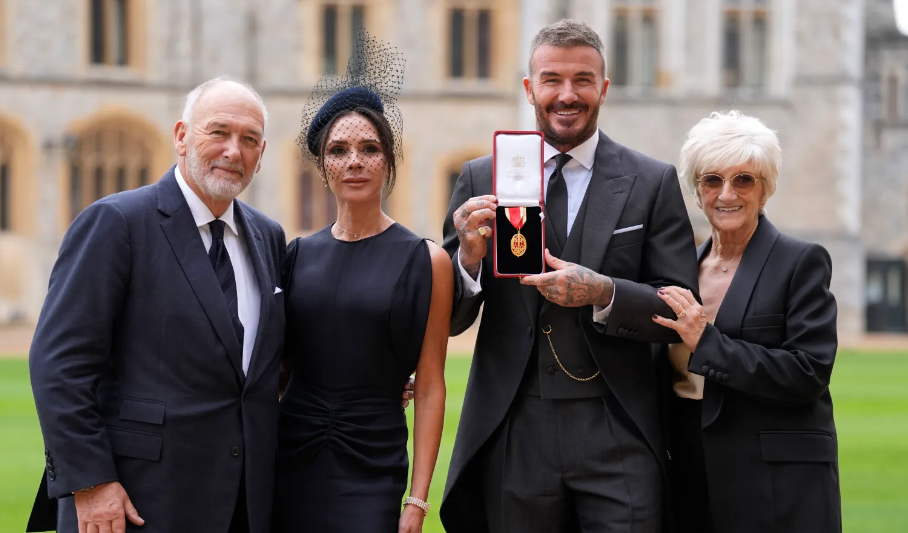 贝克汉姆的妻子维多利亚以及他的父母一同出席了仪式。维多利亚曾在2017年因对时尚产业的贡献获得大英帝国勋章(OBE),此次她亲自为丈夫设计并制作了在授勋典礼上所穿的西装。
