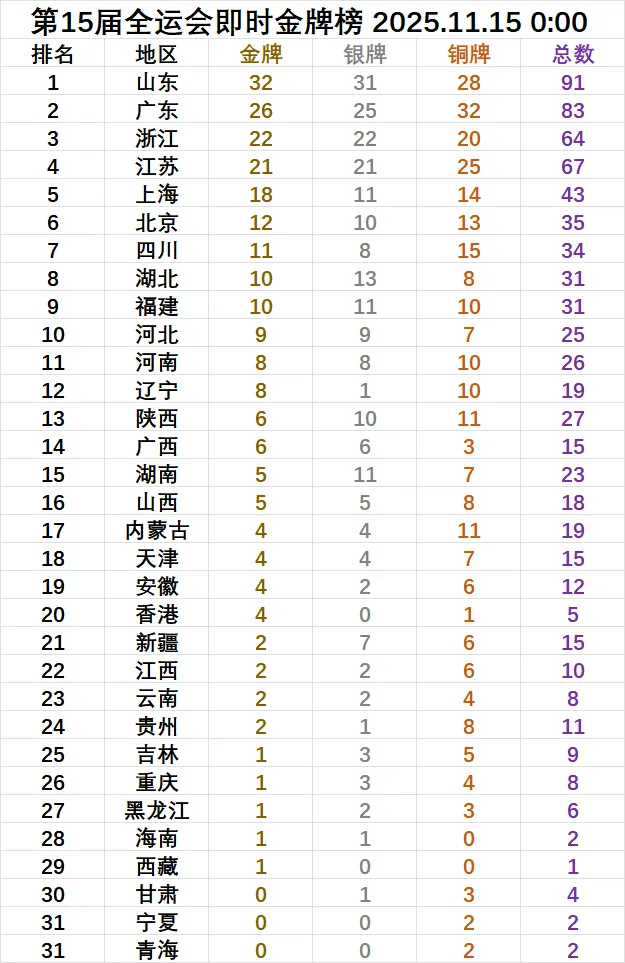 除了东道主所在地,从历届和本届全运会的整体格局来看,金牌榜头部位置基本被经济大省包揽,经济实力为体育发展提供了核心支撑。相关数据显示,截至11月13日21时,本届全运会金牌榜前六位分别是山东、广东、江苏、浙江、上海和湖北,尽管最终排名会有变化,但大格局基本成型。不难发现,目前金牌榜前五名的山东、广东、江苏、浙江、上海,恰好对应全国 GDP 相对靠前的省市。